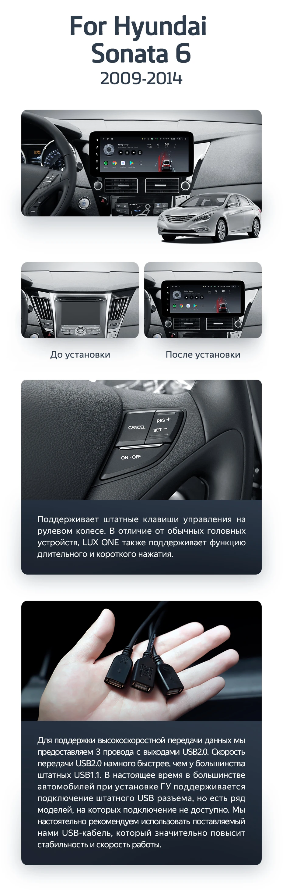 Готовый установочный комплект для магнитолы Hyundai Sonata 6 YF 2009-2014 12,3 дюймов в штатное место, включает переходную рамку и проводку.