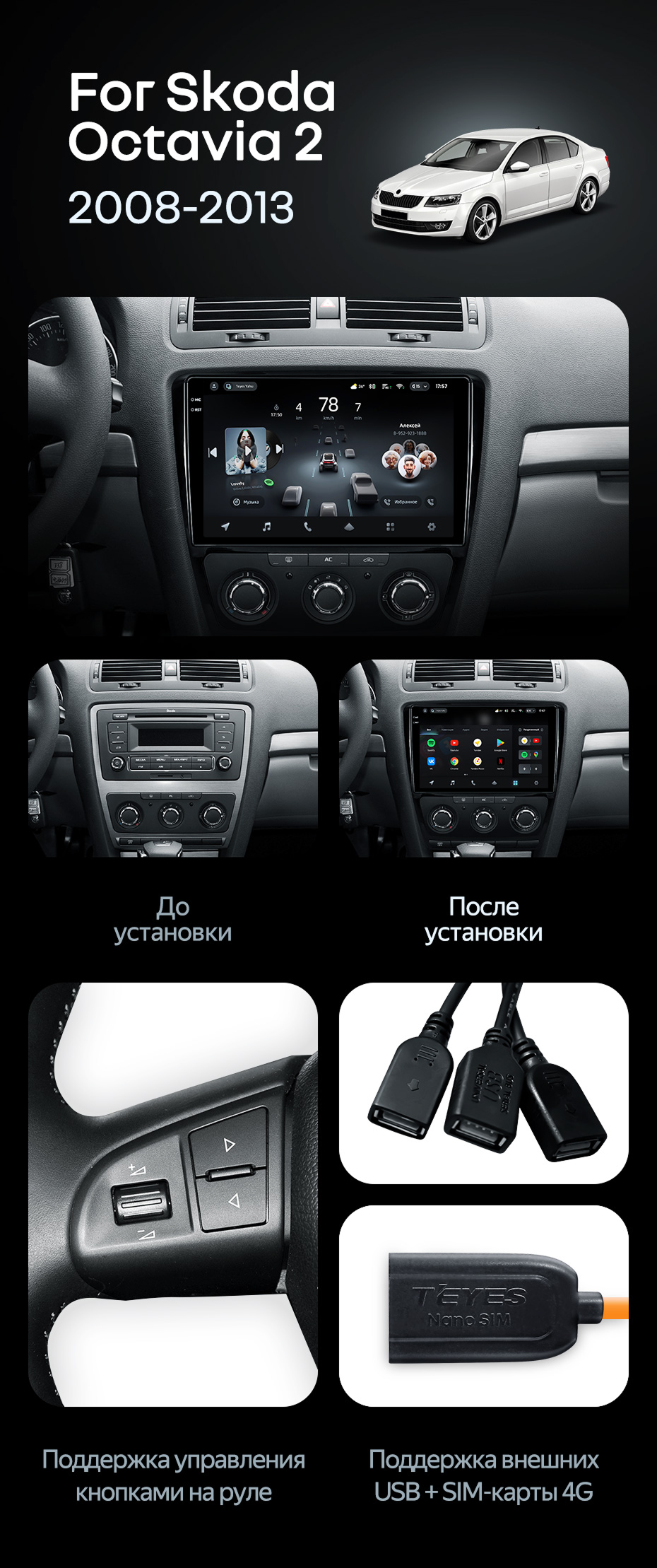 Штатная магнитола Teyes CC4 8/128 Skoda Octavia 2 A5 (2008-2013) - купить всего за 53 270 руб. в интернет-магазине в Орске Teyes.com.ru. ✓ Самый лучший выбор мультимедиа ✓ Лучшая замена штатному ГУ ✓ Тел. +7 (800) 775-31-74