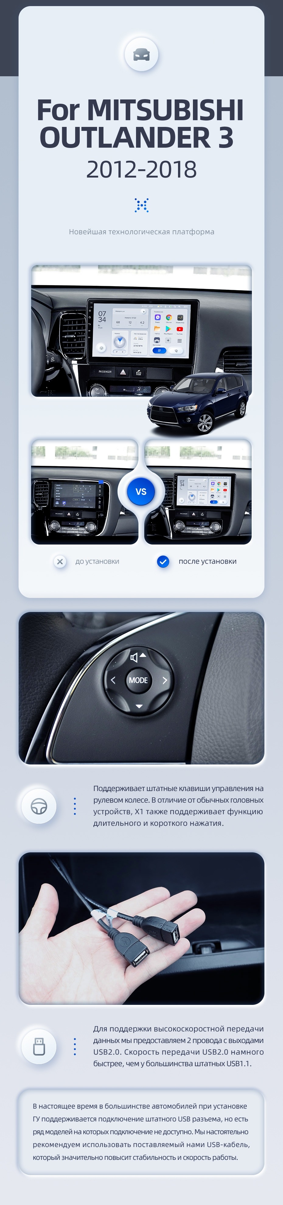 | USB | 3×USB 2.0 + USB 3.0 | Доп. аксессуары | Передняя/задняя AHD-камера, DVR-регистратор, TPMS, парковочный OBD, Type-C → HDMI |
