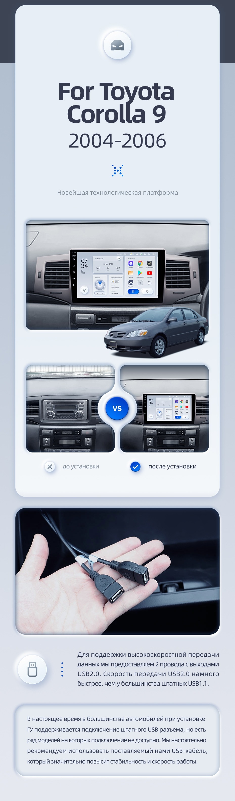 | USB | 3×USB 2.0 + USB 3.0 | Доп. аксессуары | Передняя/задняя AHD-камера, DVR-регистратор, TPMS, парковочный OBD, Type-C → HDMI |