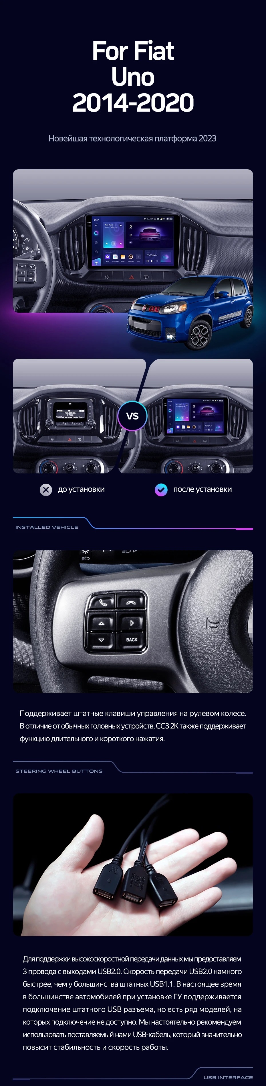 Полный комплект установки магнитолы Teyes с рамкой и проводкой можно выбрать в каталоге штатных магнитол Fiat Uno (2014-2020).