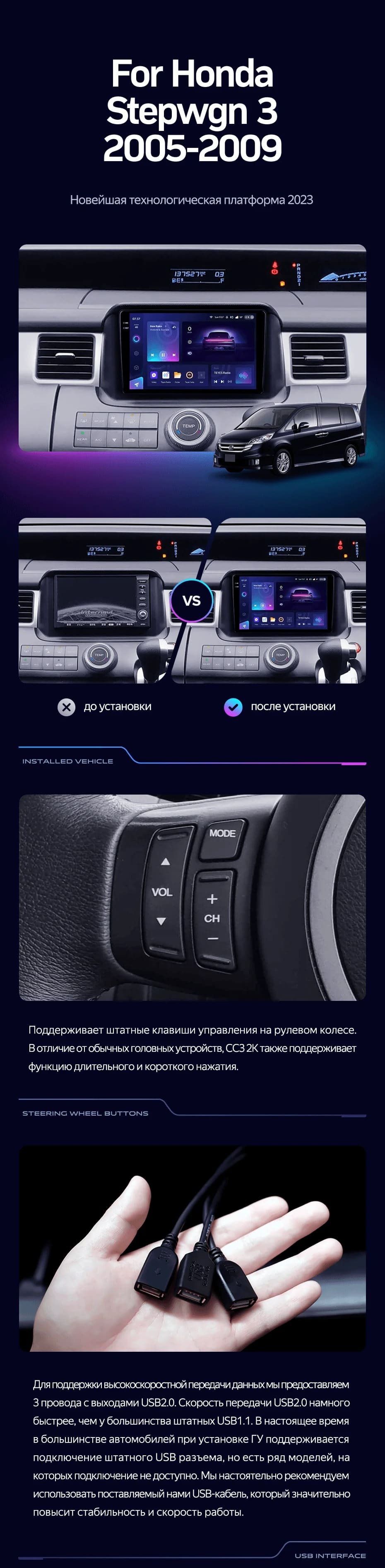 Полный комплект установки магнитолы Teyes с рамкой и проводкой можно выбрать в каталоге штатных магнитол Honda Stepwgn 3 (2005-2009).