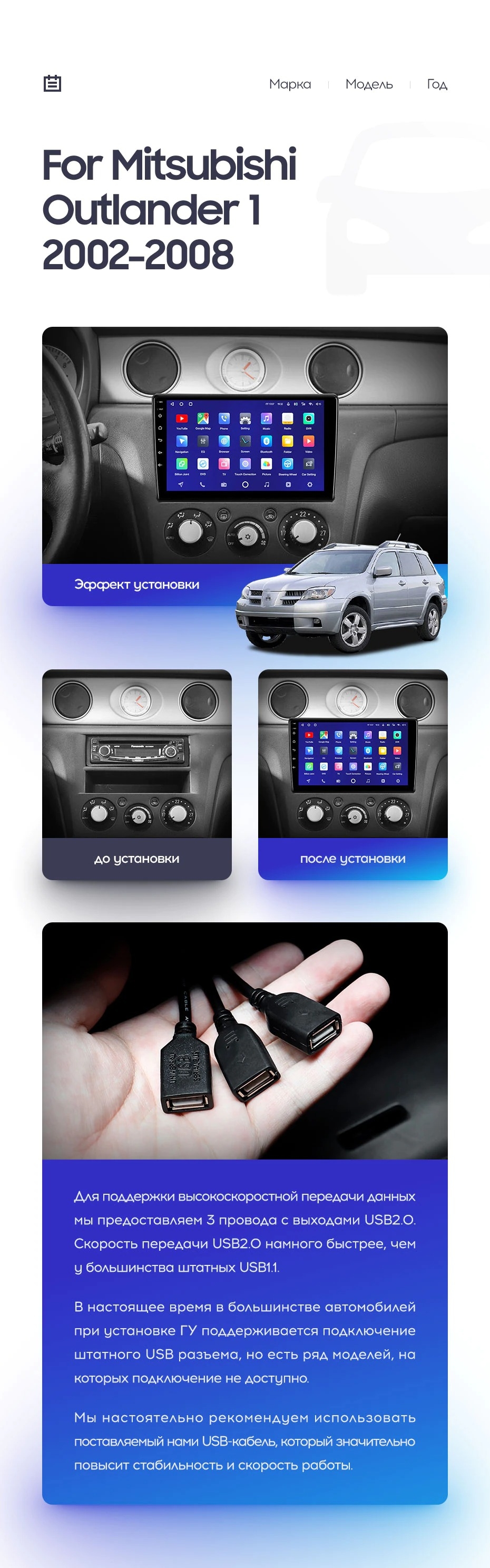 Полный комплект установки магнитолы Teyes с рамкой и проводкой можно выбрать в каталоге штатных магнитол Mitsubishi Outlander 1 (2002-2008).