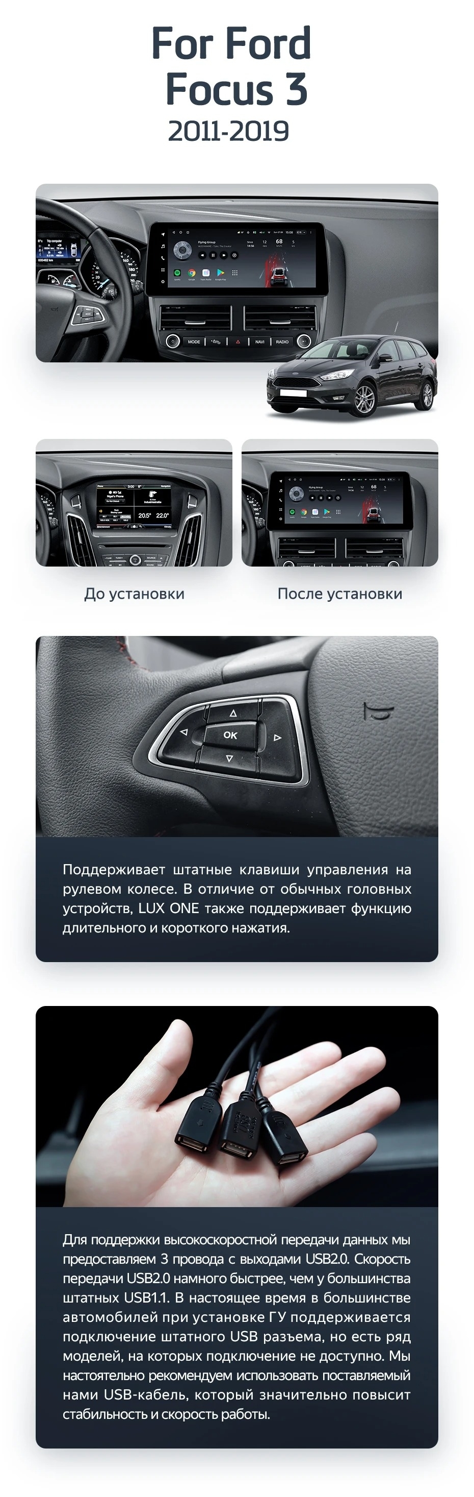 Полный комплект установки магнитолы Teyes с рамкой и проводкой можно выбрать в каталоге штатных магнитол Ford Focus 3 Mk 3 (2011-2019).
